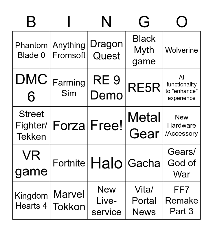 This bingo card has a free space and 24 words: Fortnite, Marvel Tokkon, RE 9 Demo, Kingdom Hearts 4, Wolverine, Phantom Blade 0, DMC 6, Anything Fromsoft, Metal Gear, Halo, RE5R, Street Fighter/ Tekken, Gacha, Gears/ God of War, Farming Sim, Vita/ Portal News, New Hardware /Accessory, Dragon Quest, AI functionality to "enhance" experience, Forza, FF7 Remake Part 3, VR game, Black Myth game and New Live-service.