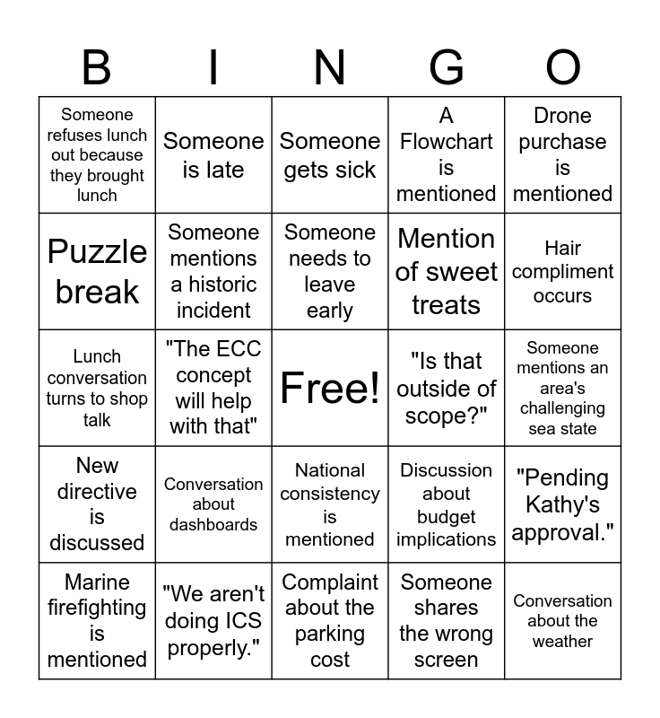 This bingo card has a free space and 32 words: Someone shares the wrong screen, A meeting runs over time, "The ECC concept will help with that", Someone uses the word mitigation, New directive is discussed, Someone mentions a historic incident, Drone purchase is mentioned, "Pending Kathy's approval.", Someone is late, Coffee spill, Someone needs to leave early, Someone gets sick, Someone asks what day it is, "were getting into the weeds.", "Is that outside of scope?", Something needs to be brought to the NMC, Marine firefighting is mentioned, Lunch conversation turns to shop talk, National consistency is mentioned, Conversation about dashboards, Discussion about budget implications, Someone mentions a template, Someone mentions an area's challenging sea state, "We aren't doing ICS properly.", Conversation about the weather, A Flowchart is mentioned, Mention of sweet treats, Puzzle break, Someone refuses lunch out because they brought lunch, Complaint about the parking cost, A trip to Bread and Sons occurs and Hair compliment occurs.