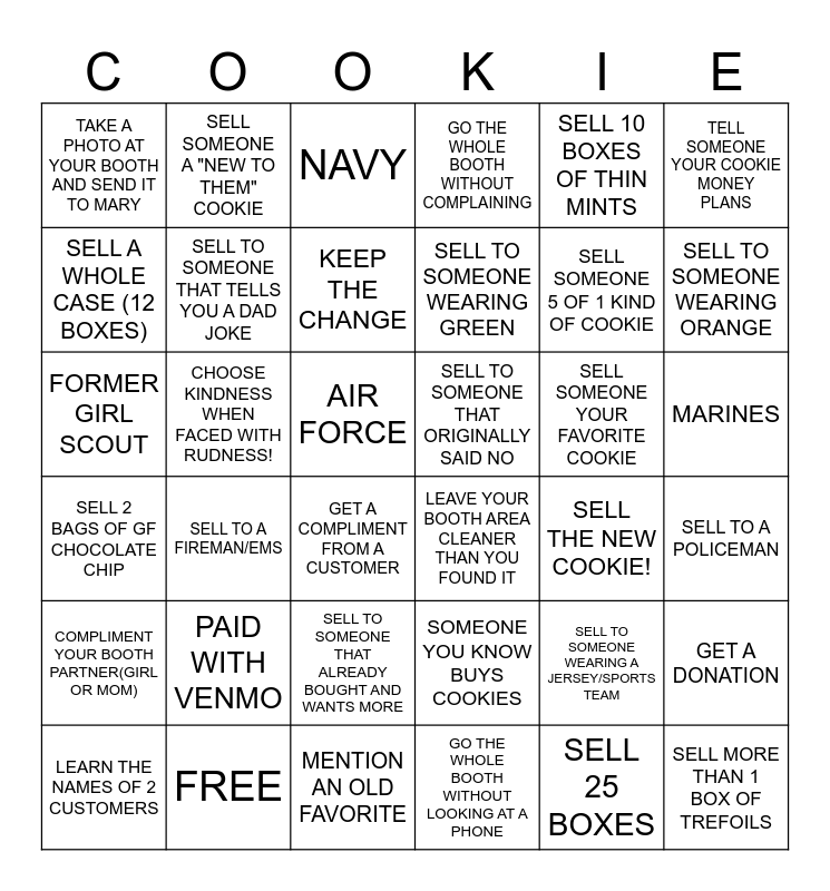 This bingo card has 42 words: SELL 25 BOXES, SELL TO SOMEONE THAT TELLS YOU A DAD JOKE, SELL MORE THAN 6 BOXES TO 1 PERSON, SELL SOMEONE YOUR FAVORITE COOKIE, SELL TO A POLICEMAN, SELL TO A FIREMAN/EMS, FORMER GIRL SCOUT, ARMY, NAVY, MARINES, AIR FORCE, SELL TO SOMEONE WEARING GREEN, SELL TO SOMEONE WEARING ORANGE, SELL 10 BOXES OF THIN MINTS, FREE, SELL 2 BAGS OF GF CHOCOLATE CHIP, GET A DONATION, SELL SOMEONE 5 OF 1 KIND OF COOKIE, SELL MORE THAN 1 BOX OF TREFOILS, SELL SOMEONE A "NEW TO THEM" COOKIE, TELL SOMEONE YOUR COOKIE MONEY PLANS, SELL TO SOMEONE THAT ALREADY BOUGHT AND WANTS MORE, COMPLIMENT YOUR BOOTH PARTNER(GIRL OR MOM), TAKE A PHOTO AT YOUR BOOTH AND SEND IT TO MARY, TELL SOMEONE ABOUT GOING TO CAMP ELK RIVER, LEARN THE NAMES OF 2 CUSTOMERS, KEEP THE CHANGE, SELL TO SOMEONE THAT GIVES YOU A TIP FOR CAMPING, PAID WITH VENMO, SELL TO SOMEONE WEARING A JERSEY/SPORTS TEAM, SELL 5 ADVENTUREFULS, SELL TO SOMEONE THAT ORIGINALLY SAID NO, SELL A WHOLE CASE (12 BOXES), SELL THE NEW COOKIE!, MENTION AN OLD FAVORITE, GET A COMPLIMENT FROM A CUSTOMER, LEAVE YOUR BOOTH AREA CLEANER THAN YOU FOUND IT, CHOOSE KINDNESS WHEN FACED WITH RUDNESS!, SOMEONE YOU KNOW BUYS COOKIES, GO THE WHOLE BOOTH WITHOUT LOOKING AT A PHONE, GO THE WHOLE BOOTH WITHOUT COMPLAINING and SELL SOMEONE YOUR LEAST FAVORITE COOKIE.