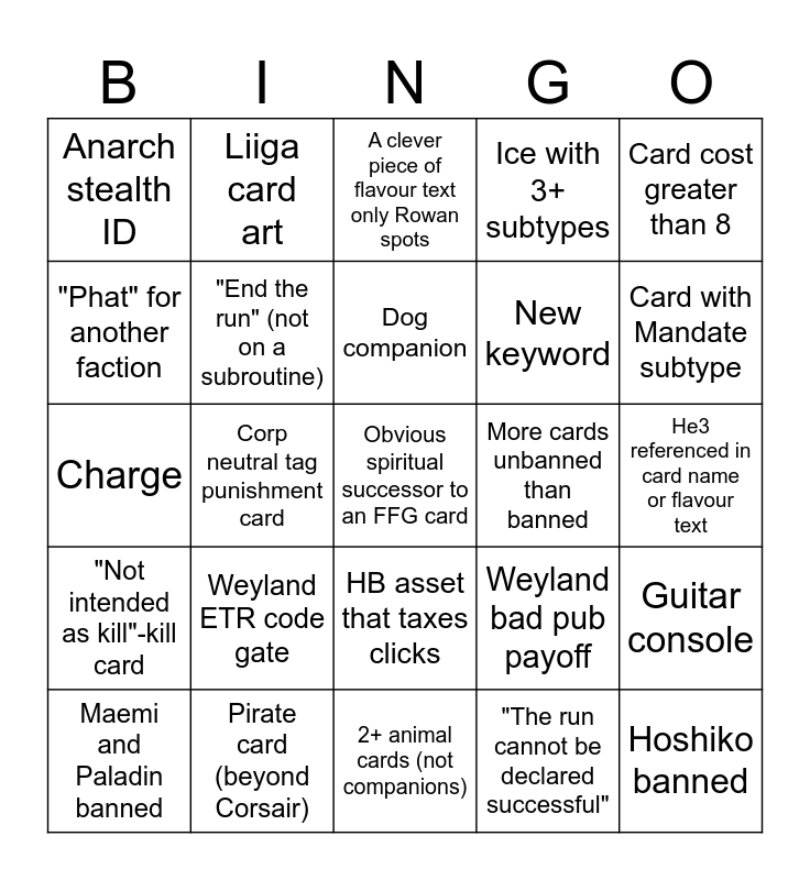 This bingo card has a free space and 24 words: Maemi and Paladin banned, Weyland ETR code gate, Dog companion, "The run cannot be declared successful", Card cost greater than 8, Anarch stealth ID, Liiga card art, A clever piece of flavour text only Rowan spots, More cards unbanned than banned, He3 referenced in card name or flavour text, Charge, "End the run" (not on a subroutine), Weyland bad pub payoff, Guitar console, "Phat" for another faction, Pirate card (beyond Corsair), 2+ animal cards (not companions), Ice with 3+ subtypes, Card with Mandate subtype, "Not intended as kill"-kill card, Corp neutral tag punishment card, HB asset that taxes clicks, New keyword and Hoshiko banned.