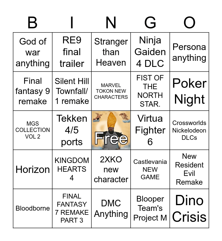 This bingo card has a free space and 24 words: KINGDOM HEARTS 4, FINAL FANTASY 7 REMAKE PART 3, MARVEL TOKON NEW CHARACTERS, Bloodborne, Persona anything, God of war anything, Final fantasy 9 remake, RE9 final trailer, Virtua Fighter 6, 2XKO new character, FIST OF THE NORTH STAR., MGS COLLECTION VOL 2, Castlevania NEW GAME, New Resident Evil Remake, Silent Hill Townfall/ 1 remake, Blooper Team's Project M, Crossworlds Nickelodeon DLCs, Stranger than Heaven, Poker Night, Tekken 4/5 ports, Dino Crisis, Horizon, Ninja Gaiden 4 DLC and DMC Anything.
