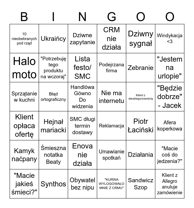 This bingo card has 36 words: Klient opłaca ofertę, Hejnał mariacki, Obywatel bez nipu, Podejrzana firma, Klient z dwubiegunowością, "Będzie dobrze" - Jacek, 10 nieobebranych pod rząd, Synthos, Dziwne zapytanie, Umawianie spotkań, Zebranie, Windykacja <3, Kamyk naćpany, Błąd ortograficzny, Lista festo/ SMC, CRM nie działa, Działania, Afera koperkowa, Halo moto, "Potrzebuję tego produktu na wczoraj", SMC długi termin dostawy, Reklamacja, Piotr Łaciński, "Macie coś do jedzenia?", Sprzątanie w kuchni, Ukraińcy, Handlówa Gówno Do widzenia, "KURWA WYLOGOWAŁO MNIE Z CRMU", Dziwny sygnał, "Jestem na urlopie", "Macie jakieś śmieci?", Śmieszna notatka Beaty, Enova nie działa, Nie ma internetu, Sandwicz Szop and Klient z Allegro anuluje zamówienie.