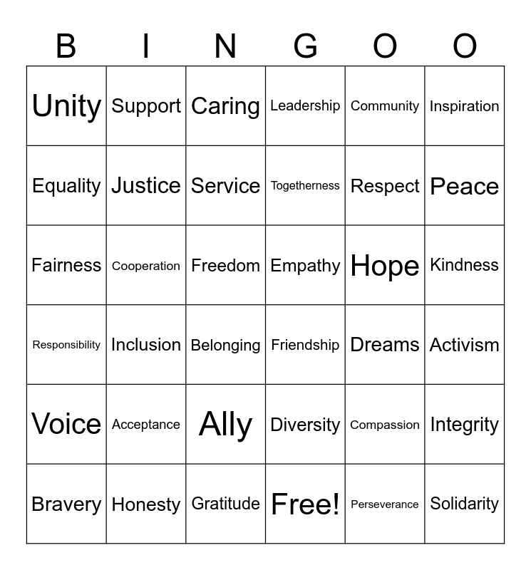 This bingo card has 41 words: Free!, Respect, Courage, Equality, Friendship, Kindness, Justice, Love, Community, Empathy, Peace, Leadership, Fairness, Freedom, Cooperation, Hope, Bravery, Unity, Perseverance, Caring, Inclusion, Voice, Dreams, Service, Solidarity, Compassion, Activism, Confidence, Togetherness, Acceptance, Role Model, Support, Belonging, Honesty, Responsibility, Inspiration, Ally, Integrity, Gratitude, Diversity and Trust.