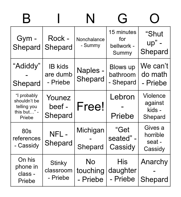 This bingo card has a free space and 68 words: Transphobia - Shepard, Anarchy - Shepard, Deshawn beef - Shepard, Military - Shepard, Pushes his political agenda - Shepard, Hates his own political beliefs - Shepard, Rock - Shepard, THE stare - Shepard, Naples - Shepard, Bouncing - Shepard, Michigan - Shepard, Dictatorship - Shepard, Violence against kids - Shepard, “Shut up” - Shepard, Girlfriend - Shepard, “Adiddy” - Shepard, Younez beef - Shepard, Gym - Shepard, Football - Shepard, NFL - Shepard, Blows up bathroom - Shepard, “Get seated” - Cassidy, 80s references - Cassidy, Tries to relate - Cassidy, Random reading - Cassidy, Unrelated references - Cassidy, Rhetorical appeals - Cassidy, Gives an assignment and everyone moans - Cassidy, Gives a horrible seat - Cassidy, Stands in front of class - Summy, Nonchalance - Summy, Summy stance - Summy, Stands over someone doing something wrong - Summy, Passive aggression - Summy, 15 minutes for bellwork - Summy, Talks about giving 0s to kids who went past 15 minutes - Summy, Ms Smiley hate - Priebe, On his phone in class - Priebe, We can’t do math - Priebe, “I probably shouldn’t be telling you this but…” - Priebe, Doesn’t know how to do something - Priebe, Brainrot - Priebe, IB kids are dumb - Priebe, Random singing - Priebe, “Stay seated” but doesn’t care - Priebe, Friday mention - Priebe, Schools don’t teach us right - Priebe, Monkey - Priebe, Lebron - Priebe, Stinky classroom - Priebe, 6th period is too quiet - Priebe, Used to not use calculators - Priebe, AI generated work - Priebe, No touching - Priebe, Engineering Degree - Priebe, 7th period glaze - Priebe, His daughter - Priebe, Threaten referrals - Priebe, Algebra kids are dumb - Priebe, Still standing after bell - Priebe, Random 80s references - Priebe, His girlfriend - Priebe, Plays 80s TV shows - Priebe, Gets mad at Karl - Priebe, Mispronounces Josiah - Priebe, Controversial topic - Priebe, Minor racism - Priebe and Debates politics with kids - Priebe.