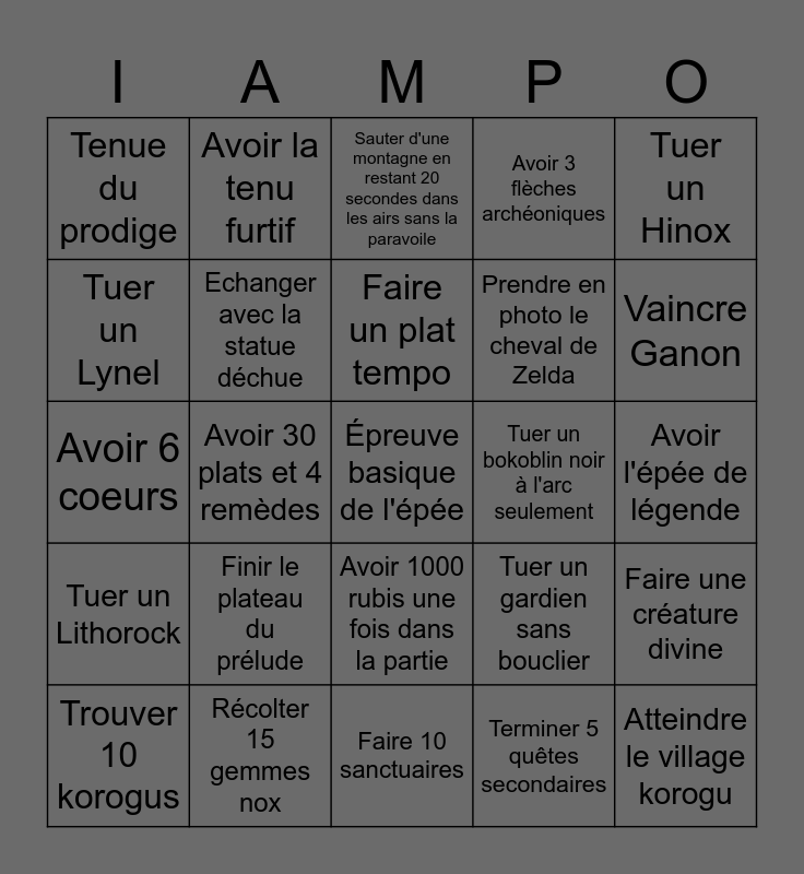 This bingo card has 25 words: Finir le plateau du prélude, Faire 10 sanctuaires, Faire un plat tempo, Trouver 10 korogus, Tuer un Hinox, Tenue du prodige, Tuer un Lynel, Avoir la tenu furtif, Tuer un bokoblin noir à l'arc seulement, Avoir 1000 rubis une fois dans la partie, Prendre en photo le cheval de Zelda, Avoir 6 coeurs, Tuer un gardien sans bouclier, Faire une créature divine, Echanger avec la statue déchue, Atteindre le village korogu, Avoir l'épée de légende, Sauter d'une montagne en restant 20 secondes dans les airs sans la paravoile, Vaincre Ganon, Avoir 30 plats et 4 remèdes, Épreuve basique de l'épée, Récolter 15 gemmes nox, Tuer un Lithorock, Avoir 3 flèches archéoniques and Terminer 5 quêtes secondaires.