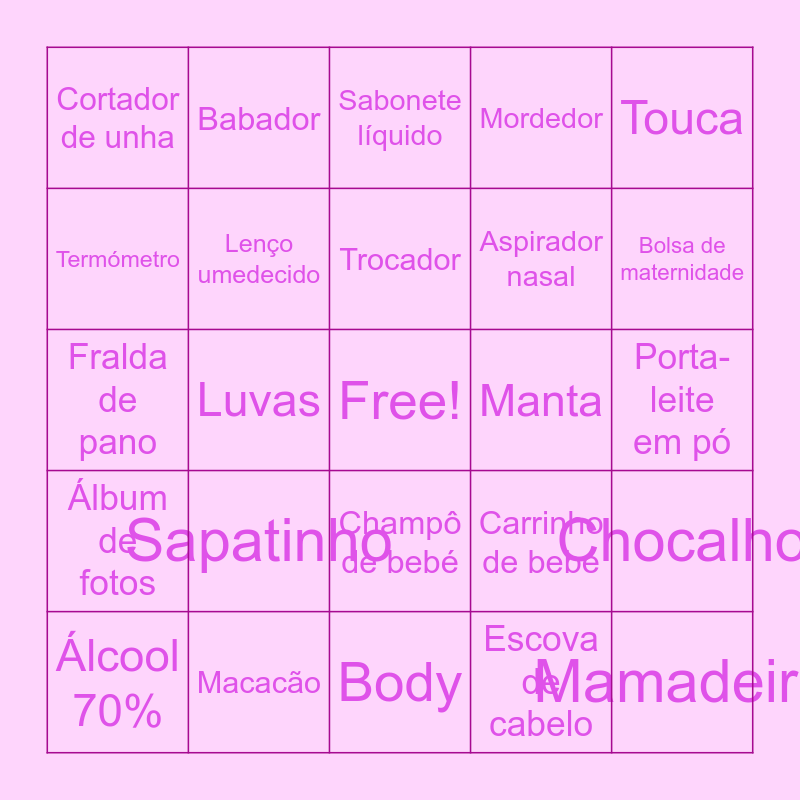 This bingo card has a free space and 50 words: Fralda descartável, Mamadeira, Chupeta, Body, Sapatinho, Meias, Babador, Toalha de banho, Termómetro, Pomada de assadura, Lenço umedecido, Mordedor, Chocalho, Carrinho de bebé, Berço, Banheira, Trocador, Manta, Cueiro, Touca, Luvas, Escova de cabelo, Cortador de unha, Aspirador nasal, Naninha, Móbile, Bolsa de maternidade, Almofada de amamentação, Sabonete líquido, Champô de bebé, Talco, Óleo corporal, Algodão, Hastes flexíveis (Cotonetes), Macacão, Mijão (Culote), Pratinho, Colher de silicone, Copo de transição, Porta-leite em pó, Babá eletrónica, Canguru / Sling, Cadeirinha de carro, Brinquedo de banho, Álcool 70%, Fralda de pano, Protetor de tomada, Livro de banho, Álbum de fotos and Pente.