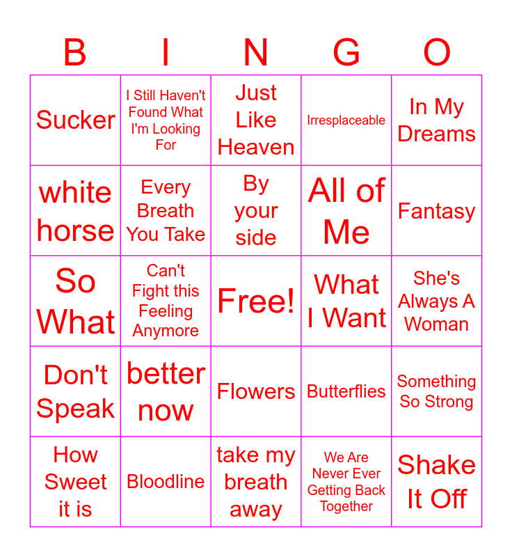 This bingo card has a free space and 204 words: God Gave me you, Crazy in Love, Lose You to Love Me, god only knows, My Heart Will Go On, Achy Brakey Heart, My Funny Valentine, Perfect, Marry Me, All of Me, Make You Feel My Love, The Power of Love, I Just Called to Say I Love You, Can't Help Falliing in Love, What's Love Got to Do With It, Love the Way You Lie, It Must Have Been Love, Crazy Little Thing Called Love, Better together, Speechless, In Case you didnt know, 10,000 Hours, Im Gonna Love you, Beautiful Things, Bloodline, What I Want, Fate of Ophelia, Tennessee Whiskey, Butterflies, Sunday Morning, Lover, How Sweet it is, Stand By Me, My Girl, Unchained Melody, Let's Stay Together, Your Song, The Way you Look Tonight, L-O-V-E, Can't Help Falling in Love, At Last, The Art of Loving, APT, Azizam, Ordinary, Yummy, How Deep is Your Love, I Will Survive, Since U Been Gone, Nothing Compares 2 U, Somone Like You, Irresplaceable, So What, Don't Speak, Go Your Own Way, We Are Never Ever Getting Back Together, thank u, next, Someone You Loved, Fake Love, Boy With Luv (feat. Halsey), kisses, I fall apart, lucid dreams, without you, memories, feel so close, innerbloom, paris, roses, I want to know what love is, man i need, an old fashioned love song, white horse, hold on we're going home, flashing lights, sunflower, better now, take my breath away, saving all my love, Yellow, kiss me, dilemma, Sucker, We belong together, Adore you, You make my dreams come true, Lovefool, By your side, Islands in the stream, Shape of my heart, I want you back, Cherish, If you had my love, tearin up my heart, Step by step, Genie in a bottle, Fantasy, 2 become 1, wannabe, (You Drive me) Crazy, As long as you love me, Always be my baby, The sign, Show me love, She's Always A Woman, bob mosses, Walking on broken glass, I want you, Rude, She will be loved, Love hurts, (Your Love Keeps Lifting Me) Higher and Higher, Bring It On Home To Me, Beth, When Something is Wrong with My Baby, Every Time You Go Away, Kiss On My List, Purple Rain, Addicted to Love, Open Arms, Don't Want to Miss a Thing, Love Somebody, Romeo and Juliette, The Flame, Heaven, Right Down the Line, Just the Way You Are, Come to my Window, I Drove All Night, Maybe I'm Amazed, All You Need is Love, I Can't Help Falling In Love With You, Suspicious Minds, Something, Happy Together, Stuck with You, Just Like Heaven, One, Can't Fight this Feeling Anymore, Feel Like Makin' Love, With or Without You, I Want You to Want Me, When It's Love, Time After Time, Faithfully, Lady In Red, Something So Strong, Don't You (Forget About Me), I'd do anything for love, (Make Me Do) Anything You Want, Love Song, I Remember You, Ain't Talkin' 'Bout Love, In My Dreams, I'll Be There For You, Never Let You Go, To Be With You, Is This Love?, Love Ain't No Stranger, I Believe in a Thing Called Love, Love is Only a Feeling, She's Gone, Permission to Dance, Gangnam Style, Dynamite, Nothing's Gonna Stop Us Now, Golden, From the Start, Island In The Sun, Will You Love Me Tomorrow, I'll Be There, You Got It All, Bad, Black or White, Motownphily, Water Runs Dry, Freedom! '90, This Is How We Do It, Don't Be Cruel, Home, Human Nature, Never Gonna Give You Up, I Think We're Alone Now, The Fate of Ophelia, Giving Her Away, What Do You Mean?, Espresso, Butter, Shake It Off, Flowers, I Knew I Loved You, Bye Bye Bye, Its Gonna Be Me, I Want It That Way, Single Ladies (Put a Ring On It), Every Breath You Take, I Still Haven't Found What I'm Looking For, Brown Eyed Girl, Where Did Our Love Go, You Can't Hurry Love, Easy On Me, Shallow, I Will Always Love You and Can't Get You Out of My Head.