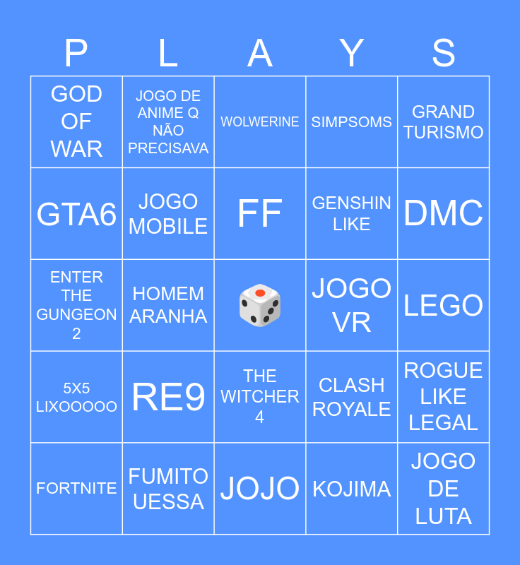 This bingo card has a free space and 24 words: RE9, FUMITO UESSA, FF, FORTNITE, GRAND TURISMO, GOD OF WAR, GTA6, JOGO DE ANIME Q NÃO PRECISAVA, JOGO VR, THE WITCHER 4, GENSHIN LIKE, ENTER THE GUNGEON 2, CLASH ROYALE, ROGUE LIKE LEGAL, JOGO MOBILE, KOJIMA, LEGO, WOLWERINE, DMC, HOMEM ARANHA, JOGO DE LUTA, 5X5 LIXOOOOO, SIMPSOMS and JOJO.