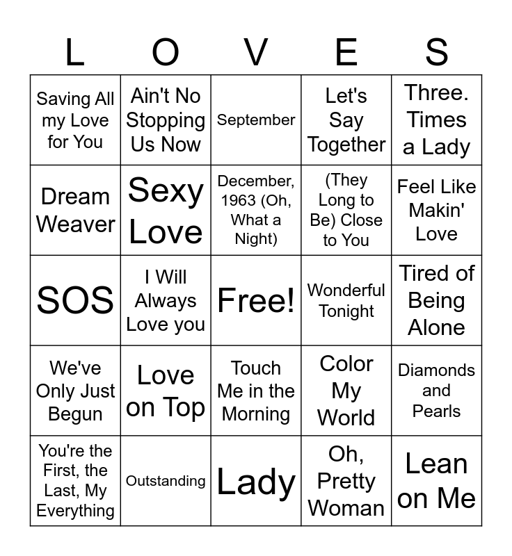 This bingo card has a free space and 56 words: I Want to Hold Your Hand, You're the First, the Last, My Everything, If You Leave Me Now, Saving All my Love for You, Lady, Let's Get It On, Sexy Love, I'll Be There, (They Long to Be) Close to You, Endless Love, Let's Say Together, Somebody to Love, If, How Deep Is your Love, You Are the Sunshine of My Life, Ain't No Mountain High Enough, Three. Times a Lady, I Will Always Love you, Just the Way You Are, Lean on Me, Wonderful Tonight, Bridge Over Troubled Water, Color My World, September, You Make Loving Fun, December, 1963 (Oh, What a Night), Could It Be I'm Falling in Love, Can't Smile. Without You, Feel Like Makin' Love, Easy, Love to Love You Baby, Have You Seen Her, Give Me Just a Little More Time, Woman In Love, Tired of Being Alone, Dream Weaver, SOS, Until You Come Back to Me, We've Only Just Begun, Ain't No Stopping Us Now, Touch Me in the Morning, Just My Imagination, Isn't She Lovely, Reasons, Anniversary, Love on Top, Outstanding, Love T.K.O., When a Man Loves a Woman, Sugar, Sugar, Oh, Pretty Woman, Please, Mr. Postman, L-O-V-E, Always Be My Baby, Diamonds and Pearls and My Boo.