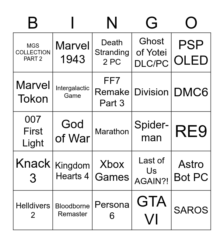 This bingo card has a free space and 24 words: Kingdom Hearts 4, Bloodborne Remaster, FF7 Remake Part 3, Helldivers 2, PSP OLED, MGS COLLECTION PART 2, Marvel Tokon, Marvel 1943, Spider-man, Xbox Games, Division, 007 First Light, Last of Us AGAIN?!, Astro Bot PC, Intergalactic Game, GTA VI, RE9, Death Stranding 2 PC, DMC6, God of War, SAROS, Knack 3, Ghost of Yotei DLC/PC and Persona 6.