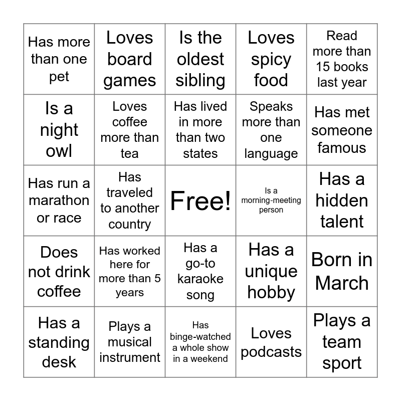This bingo card has a free space and 25 words: Has worked here for more than 5 years, Has binge‑watched a whole show in a weekend, Has lived in more than two states, Has a standing desk, Read more than 15 books last year, Has more than one pet, Is a night owl, Loves board games, Is a morning‑meeting person, Has a go‑to karaoke song, Speaks more than one language, Has run a marathon or race, Has a unique hobby, Born in March, Loves coffee more than tea, Prefers working in silence, Has a hidden talent, Is the oldest sibling, Has met someone famous, Has traveled to another country, Plays a team sport, Plays a musical instrument, Does not drink coffee, Loves spicy food and Loves podcasts.
