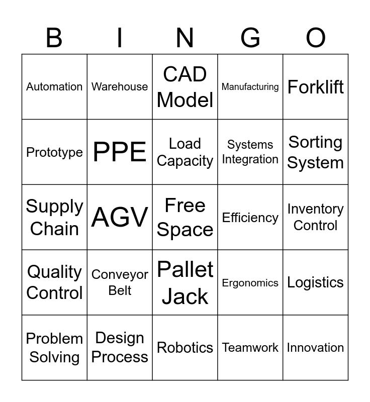 This bingo card has a free space and 24 words: Conveyor Belt, Design Process, Load Capacity, Problem Solving, Forklift, Automation, Prototype, Warehouse, Efficiency, Pallet Jack, Systems Integration, Supply Chain, Ergonomics, Logistics, PPE, Teamwork, Inventory Control, CAD Model, Sorting System, AGV, Innovation, Quality Control, Manufacturing and Robotics.