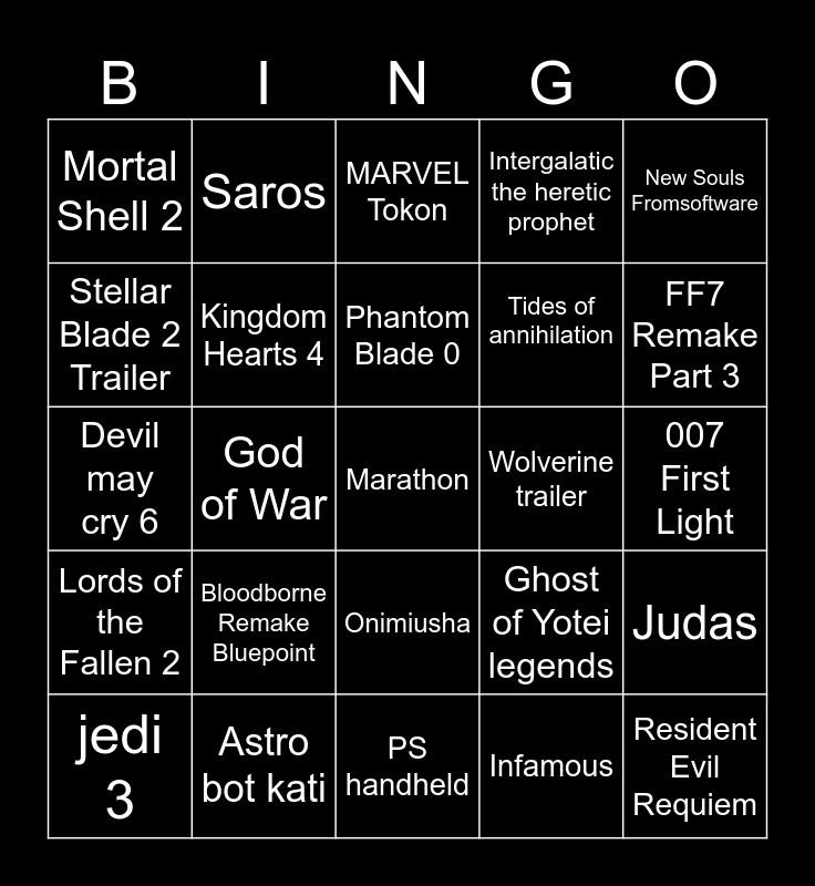 This bingo card has a free space and 24 words: Bloodborne Remake Bluepoint, Astro bot kati, Phantom Blade 0, jedi 3, New Souls Fromsoftware, Mortal Shell 2, Stellar Blade 2 Trailer, Saros, Wolverine trailer, Onimiusha, Tides of annihilation, Devil may cry 6, Ghost of Yotei legends, Judas, Kingdom Hearts 4, Infamous, 007 First Light, MARVEL Tokon, FF7 Remake Part 3, God of War, Resident Evil Requiem, Lords of the Fallen 2, Intergalatic the heretic prophet and PS handheld.