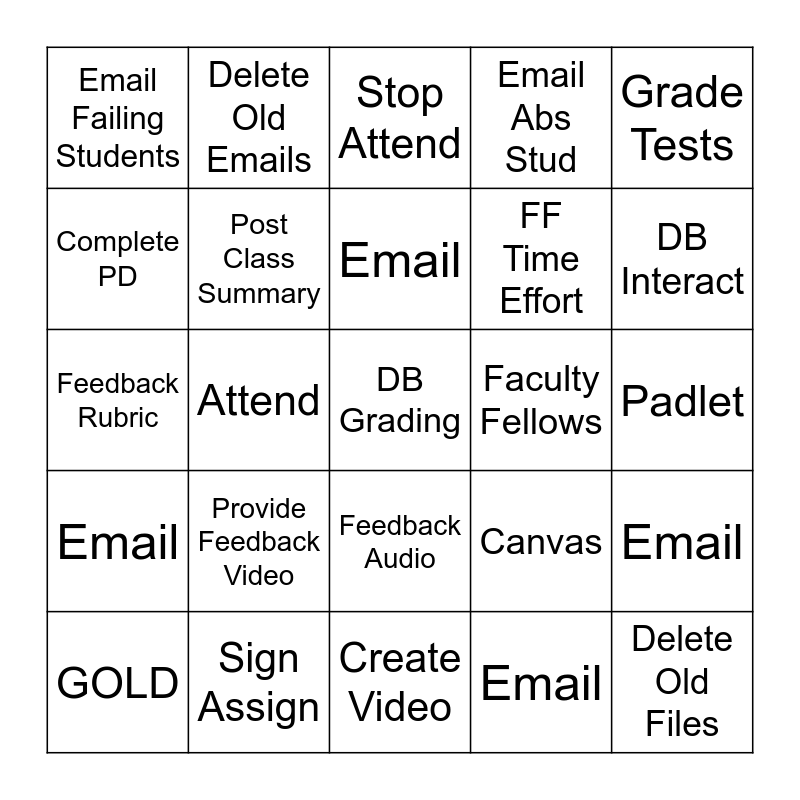 This bingo card has a free space and 25 words: Provide Feedback Video, Create Video, Email, GOLD, Grade Tests, Email Failing Students, Complete PD, Delete Old Emails, Faculty Fellows, Feedback Audio, FF Time Effort, Feedback Rubric, Canvas, Email, Post Class Summary, Email, Padlet, Stop Attend, DB Interact, Attend, Delete Old Files, Sign Assign, Email, Email Abs Stud and Email.
