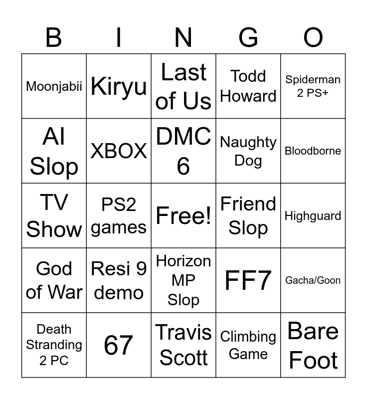 This bingo card has a free space and 24 words: Resi 9 demo, 67, DMC 6, Death Stranding 2 PC, Spiderman 2 PS+, Moonjabii, AI Slop, Kiryu, Friend Slop, Horizon MP Slop, Naughty Dog, TV Show, FF7, Gacha/Goon, XBOX, Climbing Game, Highguard, Last of Us, Bloodborne, PS2 games, Bare Foot, God of War, Todd Howard and Travis Scott.