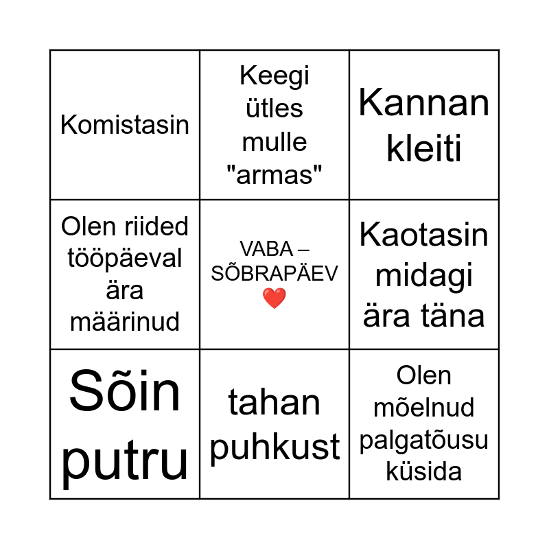 ⚠ This card has duplicate items: Seljas midagi punast (2), Sain kallistuse (2)