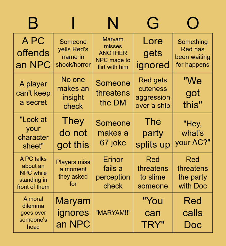 This bingo card has a free space and 24 words: Players miss a moment they asked for, Maryam ignores an NPC, Someone threatens the DM, A moral dilemma goes over someone's head, Something Red has been waiting for happens, A PC offends an NPC, A player can't keep a secret, Someone yells Red's name in shock/horror, The party splits up, Erinor fails a perception check, Red gets cuteness aggression over a ship, "Look at your character sheet", Red threatens to slime someone, Red threatens the party with Doc, No one makes an insight check, "You can TRY", "Hey, what's your AC?", Maryam misses ANOTHER NPC made to flirt with him, "We got this", They do not got this, Red calls Doc, A PC talks about an NPC while standing in front of them, Lore gets ignored and "MARYAM!!".