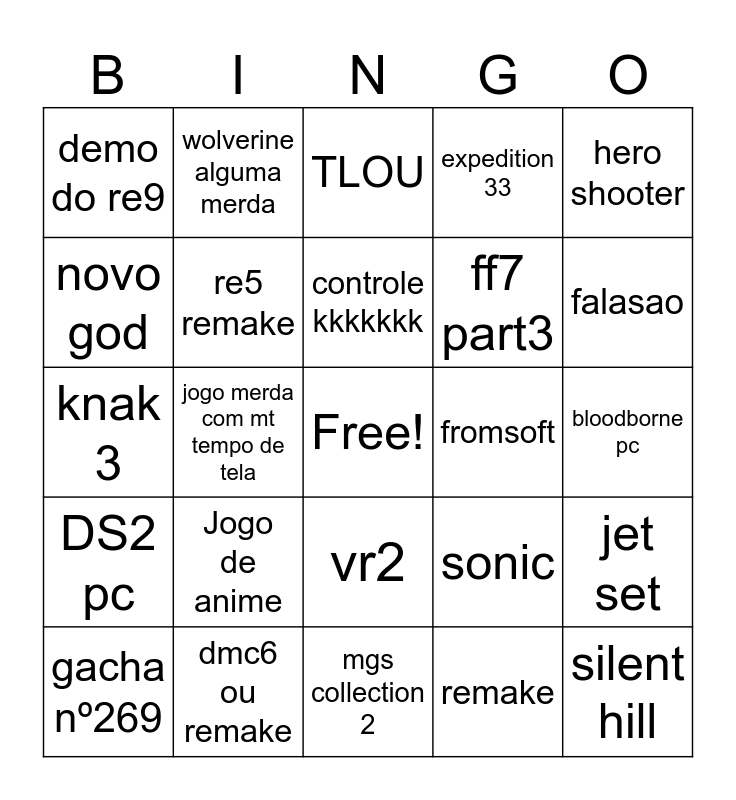 This bingo card has a free space and 24 words: Jogo de anime, dmc6 ou remake, controle kkkkkkk, gacha nº269, hero shooter, demo do re9, novo god, wolverine alguma merda, fromsoft, vr2, ff7 part3, knak 3, sonic, jet set, re5 remake, remake, bloodborne pc, TLOU, falasao, jogo merda com mt tempo de tela, silent hill, DS2 pc, expedition 33 and mgs collection 2.