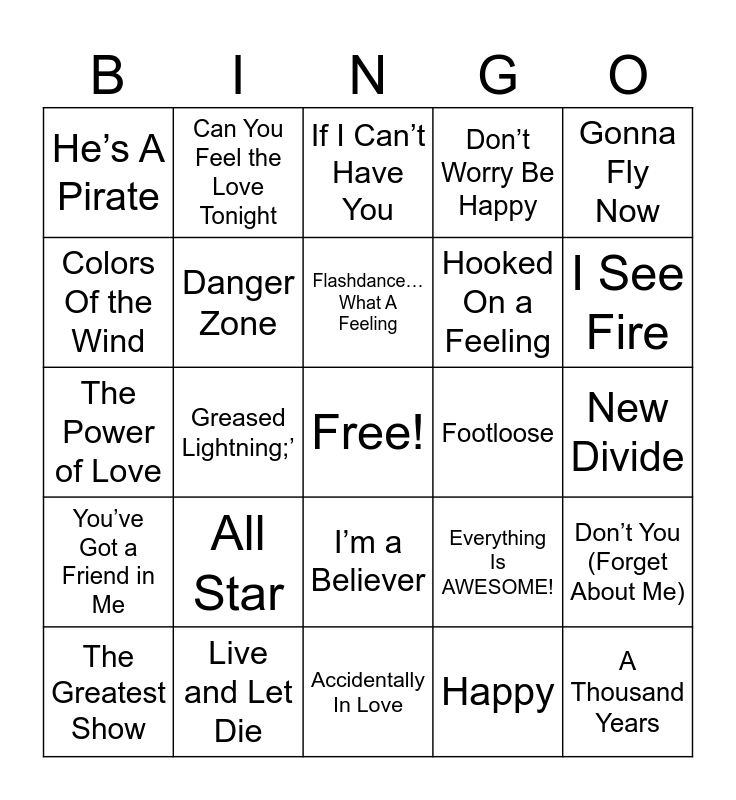 This bingo card has a free space and 50 words: (I’ve Had) The Time of My Life, A Thousand Years, A View to Kill, Accidentally In Love, All Star, Another Way to Die, Can You Feel the Love Tonight, Circle Of Life, Colors Of the Wind, Come and Get Your Love, Danger Zone, Don’t Worry Be Happy, Don’t You (Forget About Me), Everything Is AWESOME!, Eye of the Tiger, Falling Slowly, Flashdance…What A Feeling, Footloose, Ghostbusters, Gonna Fly Now, Greased Lightning;’, Happy, He’s A Pirate, Hooked On a Feeling, I Don’t Want to Miss a Thing, I Put a Spell on You, I See Fire, I Will Always Love You, If I Can’t Have You, I’m a Believer, Iris, Kiss From a Rose, Let It Go, Let’s Hear It for The Boys, Live and Let Die, Lose Yourself, Moon River, Mrs. Robinson, My Heart Will Go On, New Divide, Shallow, Skyfall, Stayin’ Alive, Stuck In the Middle with You, The Greatest Show, The Power of Love, Unchained Melody, We Don’t Talk About Bruno, You’ve Got a Friend in Me and Young and Beautiful.