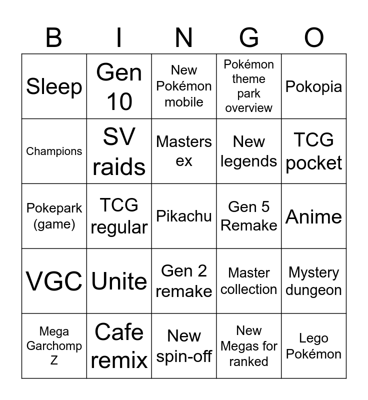 This bingo card has a free space and 24 words: Unite, Cafe remix, Masters ex, Mega Garchomp Z, Pokopia, Sleep, Champions, Gen 10, Gen 5 Remake, Gen 2 remake, New legends, Pokepark (game), Master collection, Mystery dungeon, SV raids, New Megas for ranked, Anime, New Pokémon mobile, TCG pocket, TCG regular, Lego Pokémon, VGC, Pokémon theme park overview and New spin-off.