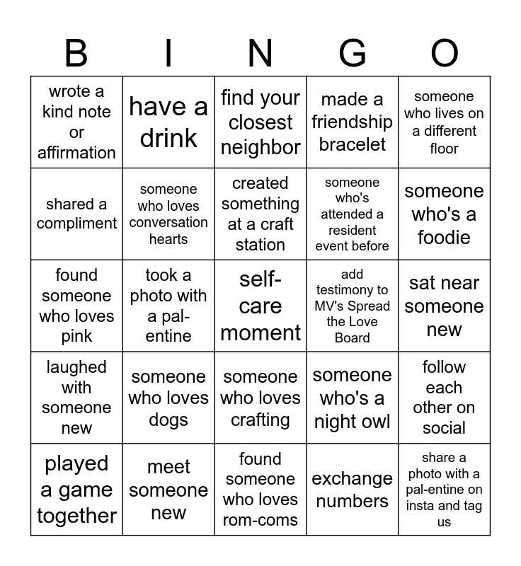 This bingo card has a free space and 24 words: someone who loves dogs, meet someone new, created something at a craft station, played a game together, someone who lives on a different floor, wrote a kind note or affirmation, shared a compliment, have a drink, add testimony to MV's Spread the Love Board, someone who loves crafting, someone who's attended a resident event before, found someone who loves pink, someone who's a night owl, follow each other on social, someone who loves conversation hearts, exchange numbers, sat near someone new, find your closest neighbor, someone who's a foodie, took a photo with a pal-entine, share a photo with a pal-entine on insta and tag us, laughed with someone new, made a friendship bracelet and found someone who loves rom-coms.