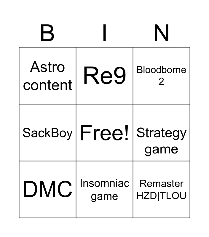 This bingo card has a free space and 8 words: Strategy game, Bloodborne 2, Re9, DMC, Astro content, Remaster HZD|TLOU, SackBoy and Insomniac game.