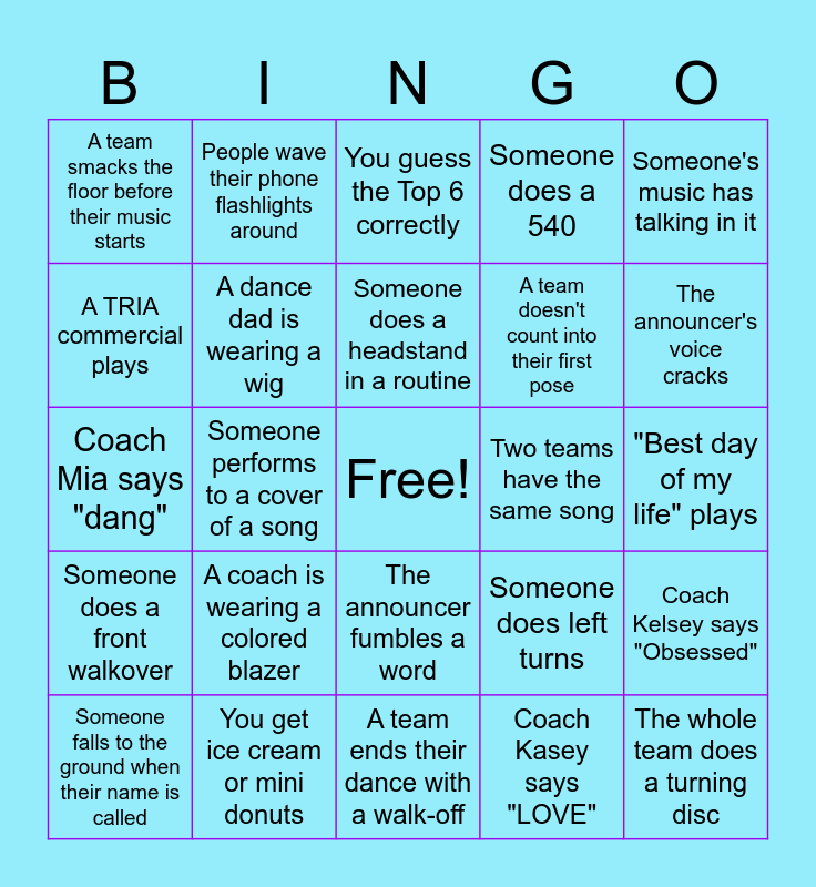 This bingo card has a free space and 39 words: "Don't Stop the Party" by Pitbull plays, A team performs in a black costume, A team wears matching sweatpants, A dance dad is wearing a wig, Someone falls to the ground when their name is called, The announcer fumbles a word, Someone does a headstand in a routine, The "wave" starts, Someone's music has talking in it, Someone does a front walkover, Someone performs to a cover of a song, Someone does a 540, The whole team does a turning disc, "Best day of my life" plays, Two teams have the same song, A coach is wearing a colored blazer, A team performs in a biketard, A team smacks the floor before their music starts, "Evacuate the dance floor" plays, Someone does left turns, A TRIA commercial plays, A team ends their dance with a walk-off, A team doesn't count into their first pose, The announcer's voice cracks, There's a tie, Someone performs to a Lady Gaga, Rihanna, or MJ song, Someone has a picture of their dancer's face on a stick, A fan is wearing a feather boa, Someone's phone has 5% battery, People wave their phone flashlights around, A coach is wearing white pants, You say hi to a dancer from another team, You guess the Top 6 correctly, You get ice cream or mini donuts, Coach Kasey says "LOVE", Coach Josie says "YESS", Coach Kelsey says "Obsessed", Coach Mia says "dang" and Someone asks "which team is this?".