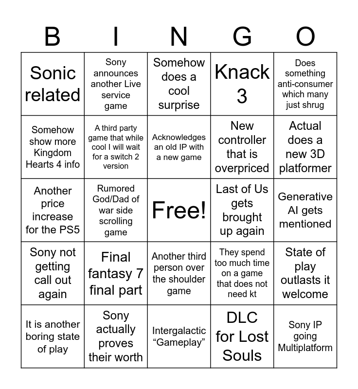 This bingo card has a free space and 24 words: Final fantasy 7 final part, Sony actually proves their worth, Acknowledges an old IP with a new game, It is another boring state of play, Does something anti-consumer which many just shrug, Sonic related, Somehow show more Kingdom Hearts 4 info, Sony announces another Live service game, Last of Us gets brought up again, Another third person over the shoulder game, New controller that is overpriced, Another price increase for the PS5, They spend too much time on a game that does not need kt, State of play outlasts it welcome, A third party game that while cool I will wait for a switch 2 version, DLC for Lost Souls, Generative AI gets mentioned, Somehow does a cool surprise, Actual does a new 3D platformer, Rumored God/Dad of war side scrolling game, Sony IP going Multiplatform, Sony not getting call out again, Knack 3 and Intergalactic “Gameplay”.
