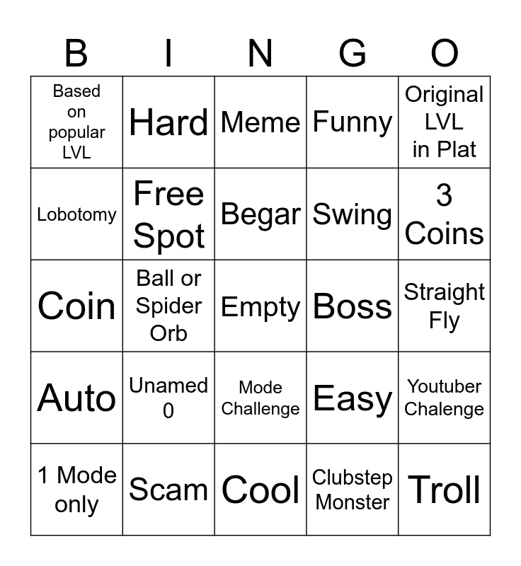 This bingo card has a free space and 24 words: Unamed 0, Scam, Begar, 1 Mode only, Original LVL in Plat, Based on popular LVL, Lobotomy, Hard, Boss, Mode Challenge, Swing, Coin, Easy, Youtuber Chalenge, Free Spot, Clubstep Monster, Straight Fly, Meme, 3 Coins, Ball or Spider Orb, Troll, Auto, Funny and Cool.