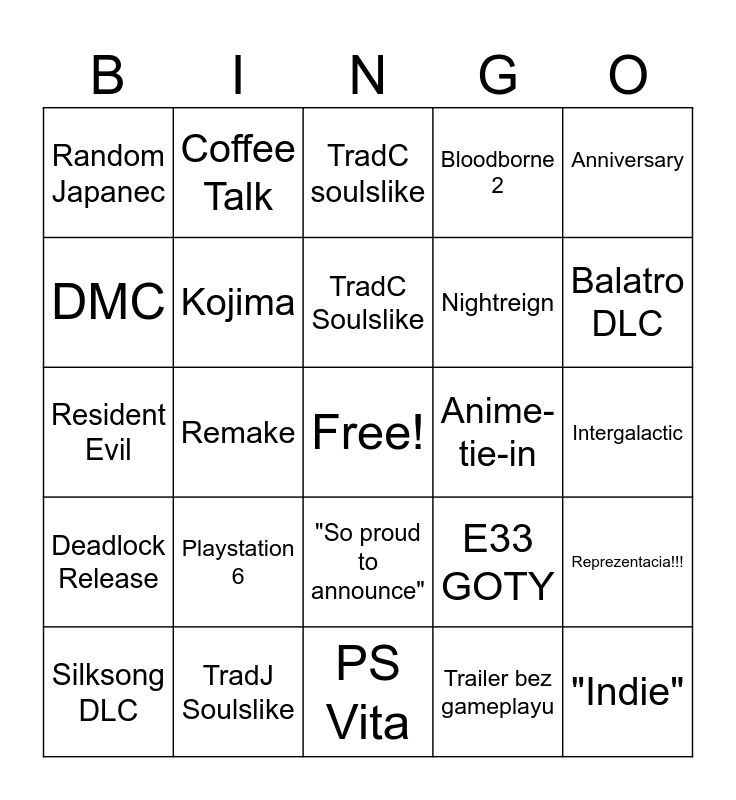 This bingo card has a free space and 24 words: Playstation 6, TradJ Soulslike, TradC Soulslike, Silksong DLC, Anniversary, Random Japanec, DMC, Coffee Talk, Anime-tie-in, "So proud to announce", Nightreign, Resident Evil, E33 GOTY, Reprezentacia!!!, Kojima, Trailer bez gameplayu, Intergalactic, TradC soulslike, Balatro DLC, Remake, "Indie", Deadlock Release, Bloodborne 2 and PS Vita.