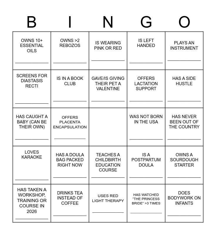 This bingo card has a free space and 29 words: HAS BEEN TO ANOTHER GALENTINES EVENT ______________, DRINKS TEA INSTEAD OF COFFEE ______________, IS WEARING PINK OR RED ______________, WOULD RATHER GET FLOWERS THAN CHOCOLATE ______________, PLAYS AN INSTRUMENT ______________, OWNS 10+ ESSENTIAL OILS ______________, IS IN A BOOK CLUB ______________, GAVE/IS GIVING THEIR PET A VALENTINE ______________, WAS NOT BORN IN THE USA ______________, OWNS A SOURDOUGH STARTER ______________, HAS TAKEN A WORKSHOP, TRAINING OR COURSE IN 2026 _____________, OFFERS PLACENTA ENCAPSULATION ______________, HAS WATCHED “THE PRINCESS BRIDE” >3 TIMES ________________, DOES BODYWORK ON INFANTS ______________, HAS CAUGHT A BABY (CAN BE THEIR OWN) ______________, OWNS A TENS UNIT ______________, USES RED LIGHT THERAPY ______________, IS A POSTPARTUM DOULA ______________, HAS A SIDE HUSTLE ______________, LOVES KARAOKE ______________, HAS A DOULA BAG PACKED RIGHT NOW ______________, HAS A VALENTINES DAY RESERVATION _____________, OFFERS LACTATION SUPPORT ______________, HAS NEVER BEEN OUT OF THE COUNTRY ______________, SCREENS FOR DIASTASIS RECTI ______________, OWNS >2 REBOZOS ______________, TEACHES A CHILDBIRTH EDUCATION COURSE ______________, IS LEFT HANDED ______________ and WATCHES “THE BACHELOR” ______________.