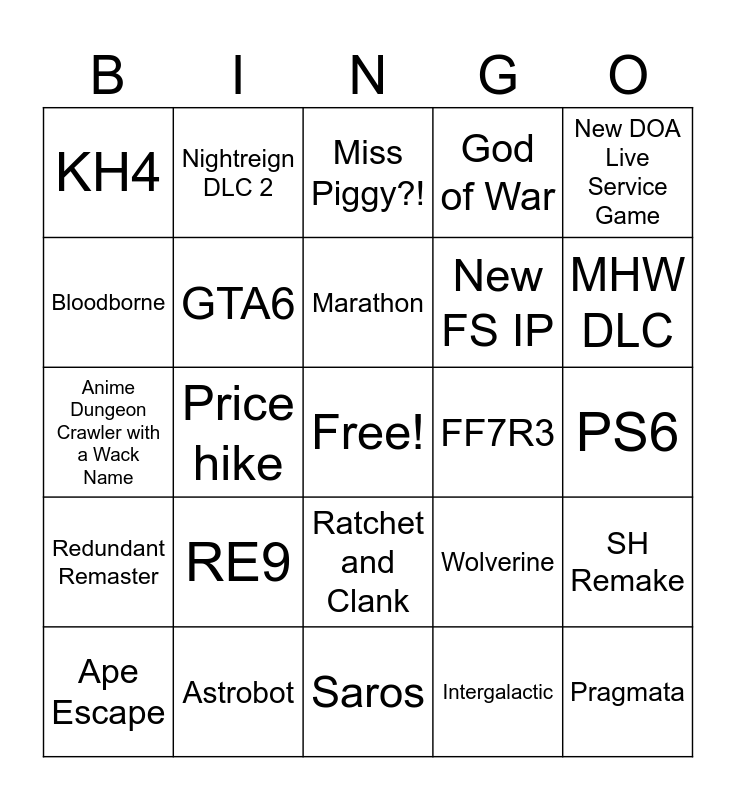 This bingo card has a free space and 24 words: RE9, Astrobot, Marathon, Ape Escape, New DOA Live Service Game, KH4, Bloodborne, Nightreign DLC 2, FF7R3, Ratchet and Clank, New FS IP, Anime Dungeon Crawler with a Wack Name, Wolverine, SH Remake, GTA6, Intergalactic, PS6, Miss Piggy?!, MHW DLC, Price hike, Pragmata, Redundant Remaster, God of War and Saros.