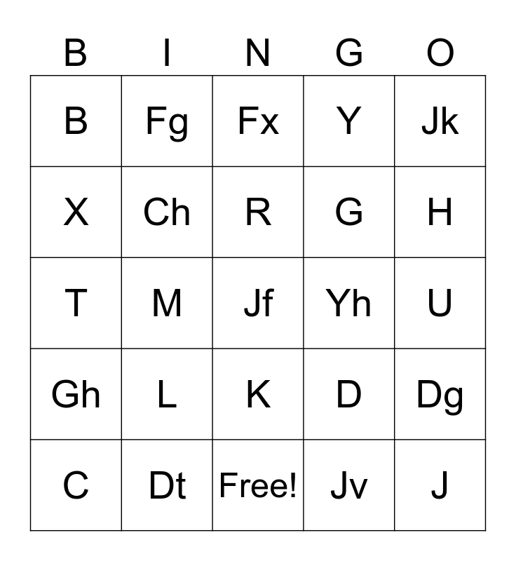This bingo card has 25 words: Gh, Dt, Jf, Jv, Jk, B, Fg, Fx, Yh, Dg, X, Ch, Free!, D, H, C, M, R, G, U, T, L, K, Y and J.
