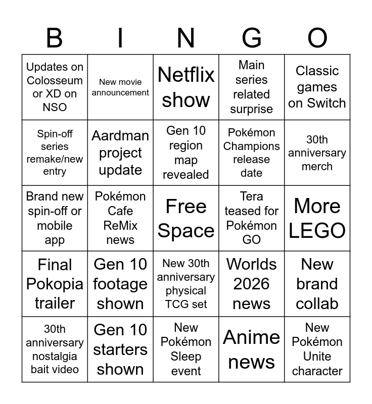 This bingo card has a free space and 24 words: Gen 10 footage shown, Gen 10 starters shown, Gen 10 region map revealed, 30th anniversary nostalgia bait video, Classic games on Switch, Updates on Colosseum or XD on NSO, Spin-off series remake/new entry, New movie announcement, Tera teased for Pokémon GO, New 30th anniversary physical TCG set, Pokémon Champions release date, Brand new spin-off or mobile app, Worlds 2026 news, New brand collab, Aardman project update, Anime news, More LEGO, Netflix show, 30th anniversary merch, Pokémon Cafe ReMix news, New Pokémon Unite character, Final Pokopia trailer, Main series related surprise and New Pokémon Sleep event.