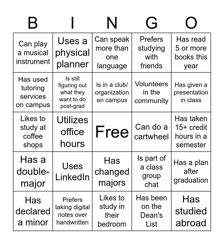 This bingo card has a free space and 24 words: Uses LinkedIn, Prefers taking digital notes over handwritten, Is in a club/ organization on campus, Has declared a minor, Has read 5 or more books this year, Can play a musical instrument, Has used tutoring services on campus, Uses a physical planner, Can do a cartwheel, Has changed majors, Volunteers in the community, Likes to study at coffee shops, Is part of a class group chat, Has a plan after graduation, Is still figuring out what they want to do post-grad, Has been on the Dean's List, Has taken 15+ credit hours in a semester, Can speak more than one language, Has given a presentation in class, Utilizes office hours, Has studied abroad, Has a double-major, Prefers studying with friends and Likes to study in their bedroom.