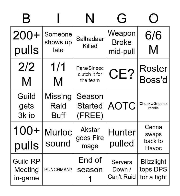 This bingo card has a free space and 24 words: Murloc sound, PUNCHMAN?, Para/Sineec clutch it for the team, Guild RP Meeting in-game, 6/6 M, 200+ pulls, 2/2 M, Someone shows up late, AOTC, Akstar goes Fire mage, CE?, Guild gets 3k io, Hunter pulled, Cenna swaps back to Havoc, 1/1 M, Servers Down / Can't Raid, Chonky/Grippiez rerolls, Salhadaar Killed, Roster Boss'd, Missing Raid Buff, Blizzlight tops DPS for a fight, 100+ pulls, Weapon Broke mid-pull and End of season 1.