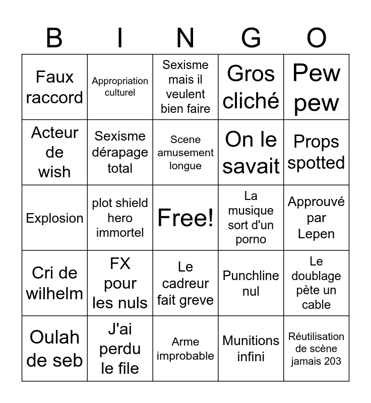 This bingo card has a free space and 29 words: Oulah de seb, Oppai pour tous, plot shield hero immortel, Incoherence, Faux raccord, Sexisme mais il veulent bien faire, Sexisme dérapage total, FX pour les nuls, La musique sort d'un porno, J'ai perdu le file, Approuvé par Lepen, Réutilisation de scène jamais 203, Arme improbable, Munitions infini, Props spotted, BEP cinéma, Le cadreur fait greve, Cri de wilhelm, Pew pew, Explosion, Punchline nul, C'était plus cool dans ma tete, On le savait, Acteur de wish, Gros cliché, Appropriation culturel, Le doublage pète un cable, Scene amusement longue and Nanard validé.
