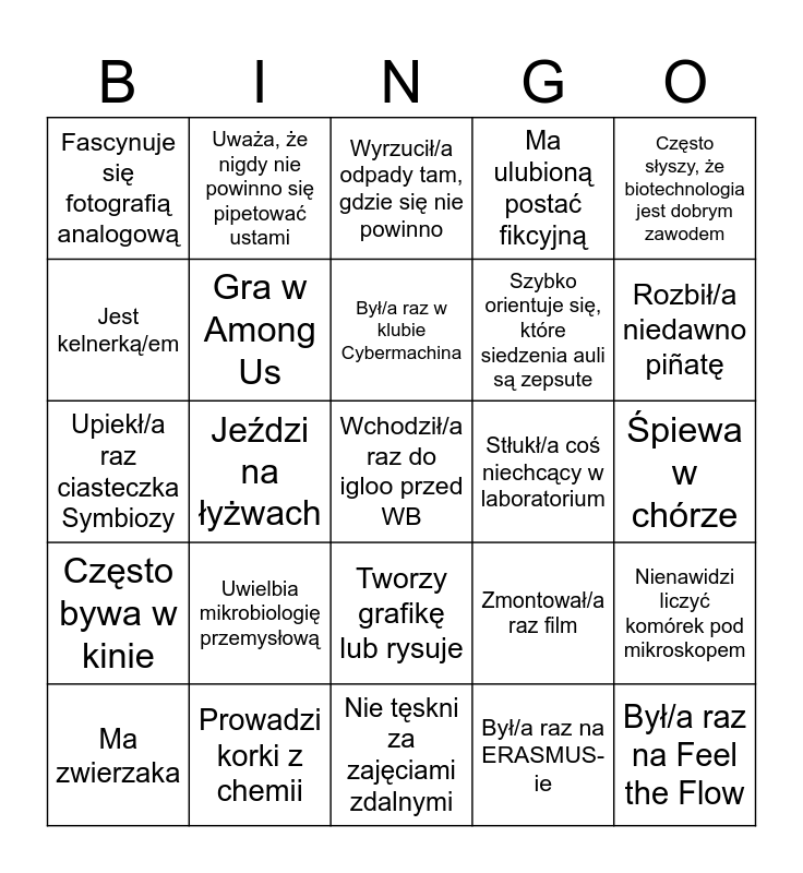 This bingo card has a free space and 24 words: Uwielbia mikrobiologię przemysłową, Prowadzi korki z chemii, Był/a raz w klubie Cybermachina, Ma zwierzaka, Często słyszy, że biotechnologia jest dobrym zawodem, Fascynuje się fotografią analogową, Jest kelnerką/em, Uważa, że nigdy nie powinno się pipetować ustami, Stłukł/a coś niechcący w laboratorium, Tworzy grafikę lub rysuje, Szybko orientuje się, które siedzenia auli są zepsute, Upiekł/a raz ciasteczka Symbiozy, Zmontował/a raz film, Nienawidzi liczyć komórek pod mikroskopem, Gra w Among Us, Był/a raz na ERASMUS-ie, Śpiewa w chórze, Wyrzucił/a odpady tam, gdzie się nie powinno, Rozbił/a niedawno piñatę, Jeździ na łyżwach, Był/a raz na Feel the Flow, Często bywa w kinie, Ma ulubioną postać fikcyjną and Nie tęskni za zajęciami zdalnymi.