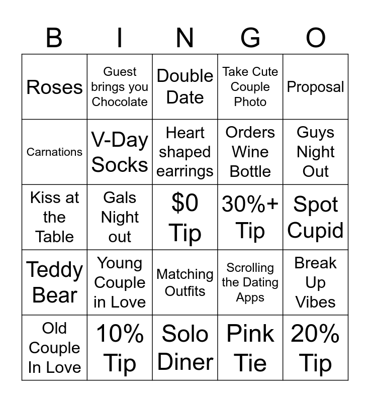 This bingo card has a free space and 24 words: Young Couple in Love, 10% Tip, Heart shaped earrings, Old Couple In Love, Proposal, Roses, Carnations, Guest brings you Chocolate, 30%+ Tip, Matching Outfits, Orders Wine Bottle, Kiss at the Table, Scrolling the Dating Apps, Break Up Vibes, V-Day Socks, Pink Tie, Spot Cupid, Double Date, Guys Night Out, Gals Night out, 20% Tip, Teddy Bear, Take Cute Couple Photo and Solo Diner.