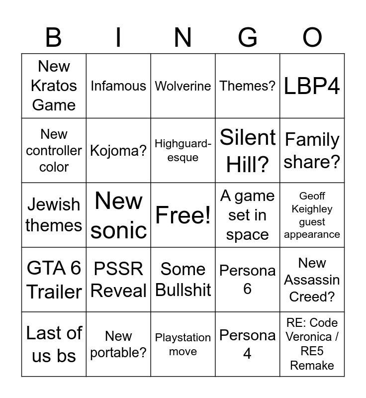 This bingo card has a free space and 24 words: Last of us bs, PSSR Reveal, Highguard-esque, Persona 4, LBP4, New Kratos Game, Infamous, Wolverine, A game set in space, Geoff Keighley guest appearance, Jewish themes, Kojoma?, Persona 6, New Assassin Creed?, New controller color, New portable?, Playstation move, Themes?, Family share?, GTA 6 Trailer, New sonic, Some Bullshit, Silent Hill? and RE: Code Veronica / RE5 Remake.