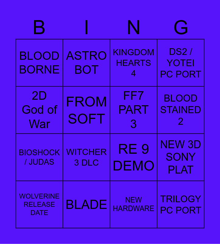 This bingo card has 16 words: BLADE, NEW 3D SONY PLAT, KINGDOM HEARTS 4, BLOOD BORNE, BIOSHOCK / JUDAS, ASTRO BOT, RE 9 DEMO, NEW HARDWARE, 2D God of War, FROM SOFT, WOLVERINE RELEASE DATE, DS2 / YOTEI PC PORT, WITCHER 3 DLC, BLOOD STAINED 2, FF7 PART 3 and TRILOGY PC PORT.