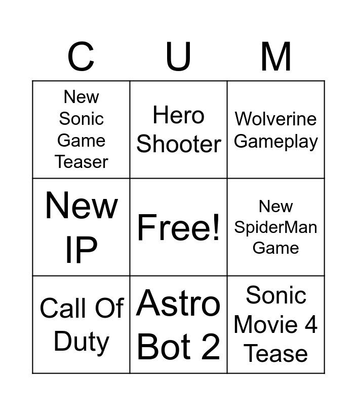 This bingo card has a free space and 8 words: New SpiderMan Game, Wolverine Gameplay, Hero Shooter, Call Of Duty, New Sonic Game Teaser, Sonic Movie 4 Tease, New IP and Astro Bot 2.