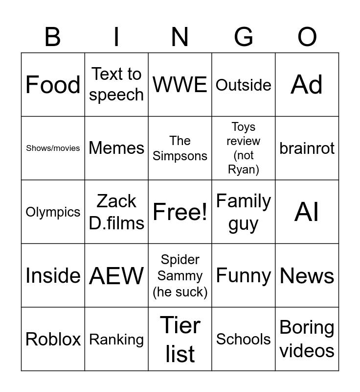 This bingo card has a free space and 24 words: Roblox, AEW, The Simpsons, Schools, Ad, Food, Text to speech, WWE, Family guy, AI, Olympics, Memes, Funny, News, Shows/movies, Ranking, Tier list, Outside, brainrot, Inside, Zack D.films, Spider Sammy (he suck), Toys review (not Ryan) and Boring videos.