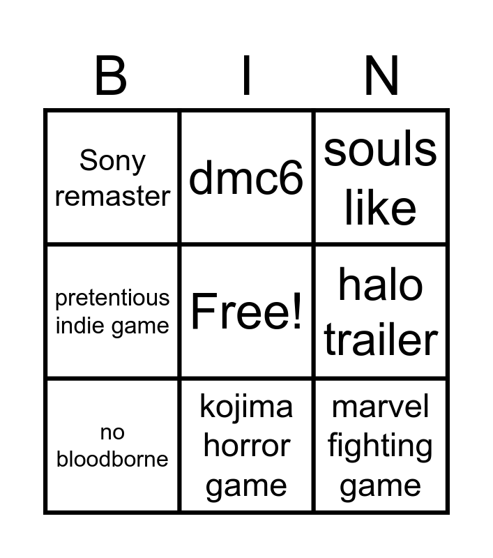 This bingo card has a free space and 8 words: halo trailer, souls like, dmc6, no bloodborne, Sony remaster, marvel fighting game, pretentious indie game and kojima horror game.