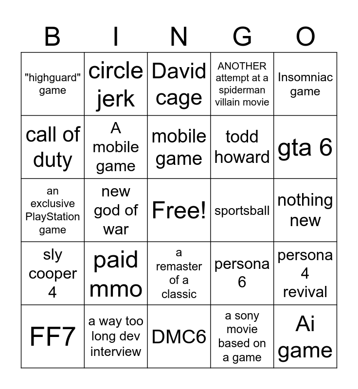 This bingo card has a free space and 24 words: paid mmo, a way too long dev interview, mobile game, FF7, Insomniac game, "highguard" game, call of duty, circle jerk, sportsball, a remaster of a classic, todd howard, an exclusive PlayStation game, persona 6, persona 4 revival, A mobile game, a sony movie based on a game, nothing new, David cage, gta 6, new god of war, Ai game, sly cooper 4, ANOTHER attempt at a spiderman villain movie and DMC6.