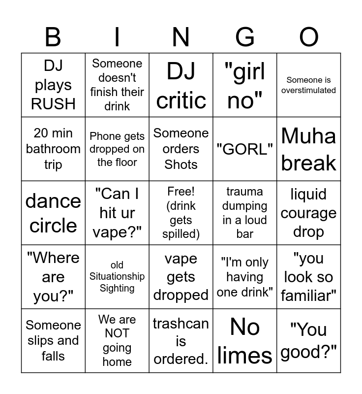 This bingo card has a free space and 24 words: old Situationship Sighting, We are NOT going home, Someone orders Shots, Someone slips and falls, Someone is overstimulated, DJ plays RUSH, 20 min bathroom trip, Someone doesn't finish their drink, trauma dumping in a loud bar, vape gets dropped, "GORL", dance circle, "I'm only having one drink", "you look so familiar", Phone gets dropped on the floor, No limes, liquid courage drop, DJ critic, Muha break, "Can I hit ur vape?", "You good?", "Where are you?", "girl no" and trashcan is ordered..