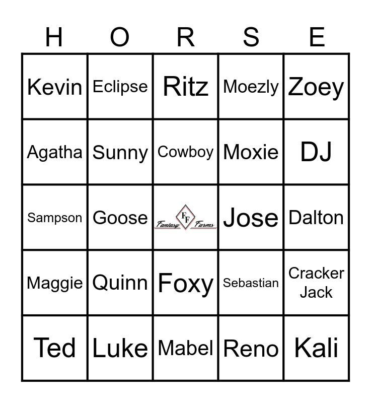 This bingo card has a free space and 29 words: Ted, Gus, Goose, Diva, Kevin, Ritz, Sunny, Quinn, Jose, Luke, Dalton, Kali, Mabel, Reno, DJ, Faith, Foxy, Maggie, Zoey, Sampson, Sebastian, Lacey, Moxie, Agatha, Moezly, Eclipse, Cracker Jack, Cowboy and Ruby.