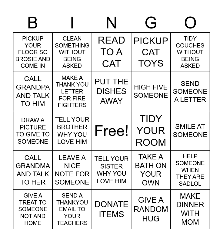 This bingo card has a free space and 24 words: LEAVE A NICE NOTE FOR SOMEONE, SEND A THANKYOU EMAIL TO YOUR TEACHERS, PUT THE DISHES AWAY, GIVE A TREAT TO SOMEONE NOT AND HOME, TIDY COUCHES WITHOUT BEING ASKED, PICKUP YOUR FLOOR SO BROSIE AND COME IN, CALL GRANDPA AND TALK TO HIM, CLEAN SOMETHING WITHOUT BEING ASKED, TIDY YOUR ROOM, TELL YOUR SISTER WHY YOU LOVE HIM, HIGH FIVE SOMEONE, DRAW A PICTURE TO GIVE TO SOMEONE, TAKE A BATH ON YOUR OWN, HELP SOMEONE WHEN THEY ARE SADLOL, MAKE A THANK YOU LETTER FOR FIRE FIGHTERS, GIVE A RANDOM HUG, SMILE AT SOMEONE, READ TO A CAT, SEND SOMEONE A LETTER, TELL YOUR BROTHER WHY YOU LOVE HIM, MAKE DINNER WITH MOM, CALL GRANDMA AND TALK TO HER, PICKUP CAT TOYS and DONATE ITEMS.