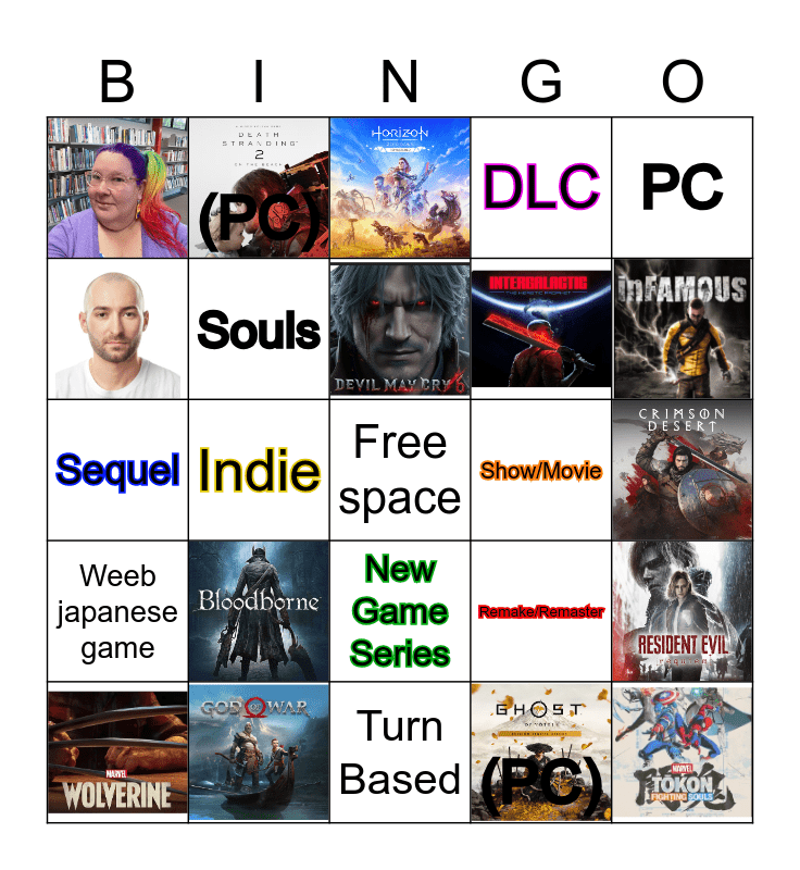 This bingo card has 14 images, a free space and 12 words: PC, (PC), Show/Movie, New Game Series, Sequel, Remake/Remaster, Souls, (PC), Indie, Weeb japanese game, DLC and Turn Based.