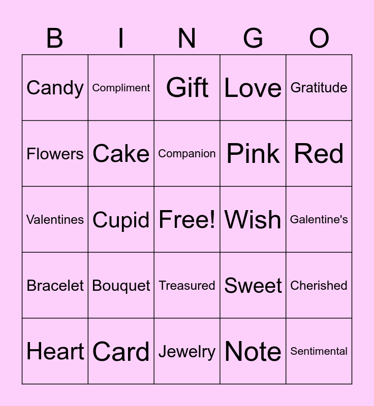 This bingo card has a free space and 29 words: Heart, Chocolate, Cupid, Rose, Candy, Gift, Cake, Bouquet, Wish, Card, Galentine's, Sentimental, Jewelry, Note, Red, Necklace, Treasured, Bracelet, Gratitude, Valentines, Sweet, Ring, Pink, Flowers, Love, Compliment, Cherished, Companion and Smile.